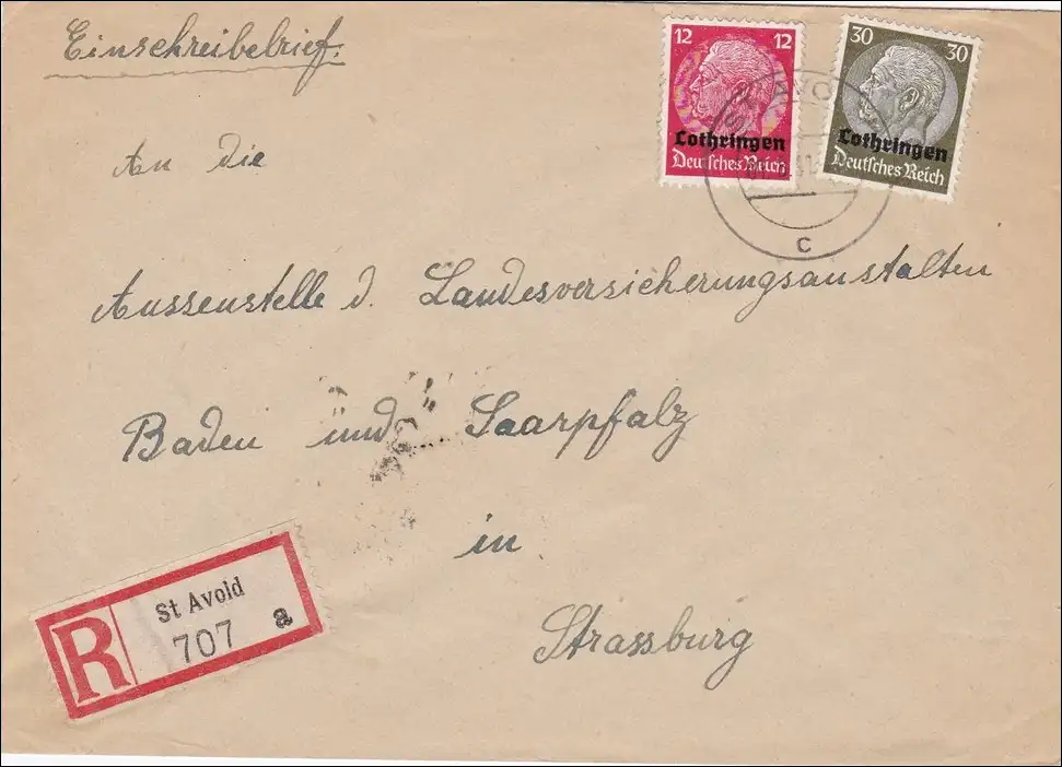 Lorraine: recommandé de St. Avold à Strasbourg 1941