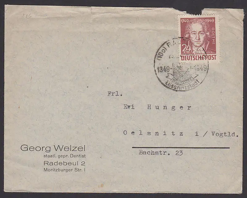 L”ssnitzstadt Radebeul SSt. 1349 - 1949, Fernbrief mit 24+16 Pfg. J. W. von Goethe (236)