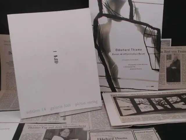 Ekkehard Thieme "mit Meeresblick" und eine Einführung von Dr. Joachim Kruse. In Zusammenarbeit mit dem Städtischen Museum Schleswig. Eine Buch und eine Zugabe. Besitzvermerk. Mit handschriftlicher Signatur des Künstlers. Einband teils gering fleckig. Sonst guter Gesamtzustand. Mit 3 Einladungen und sieben Zeitungsauschnitten als Beilage. Als Zugabe: Peter Nicolaisen in Verbindung mit dem Kunstverein Flensburg (Hg.)/ Ekkehard Thieme. Kunst im öffentlichen Raum