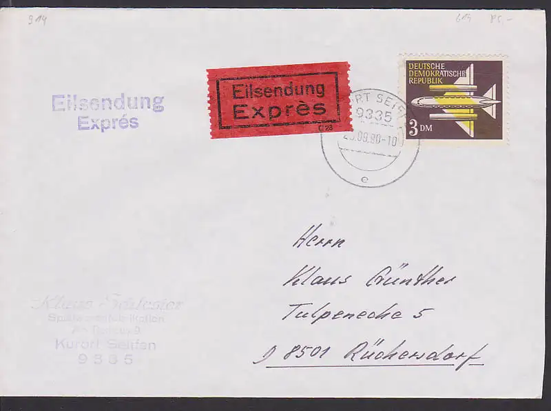Luftpost 3 DM Eil-Bf rs. Eing,-St. (914), portogenau aus Kurort Seiffen 26.9.90