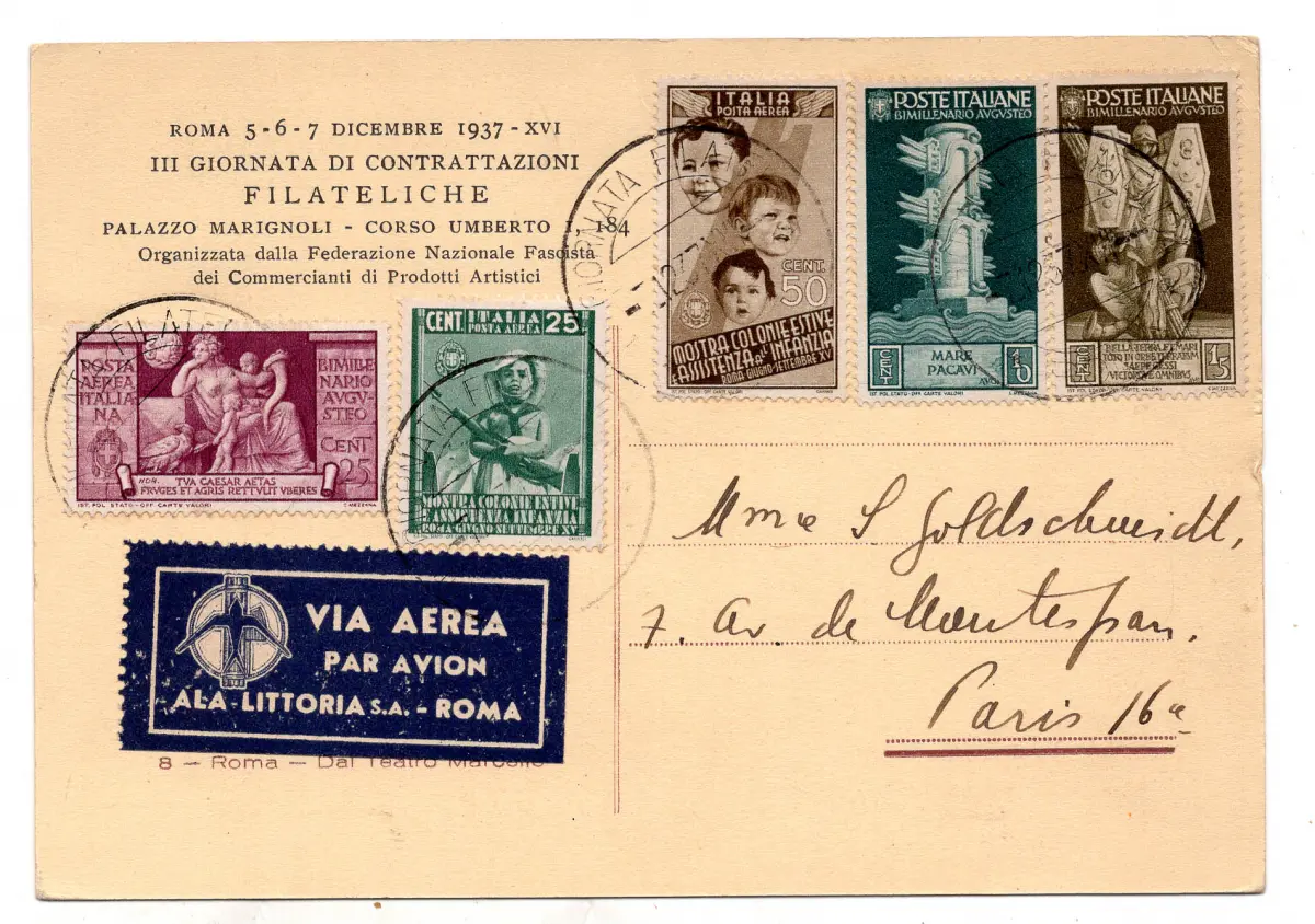 C - Luftpost - fünf Werte der Serie Kindheit und Augustus Nr. 100 + 101 + 106 + P.O. 416 + 417 auf Postkarte nach Paris am 5.12.37 - Kat. euro 400 Cod.70/182