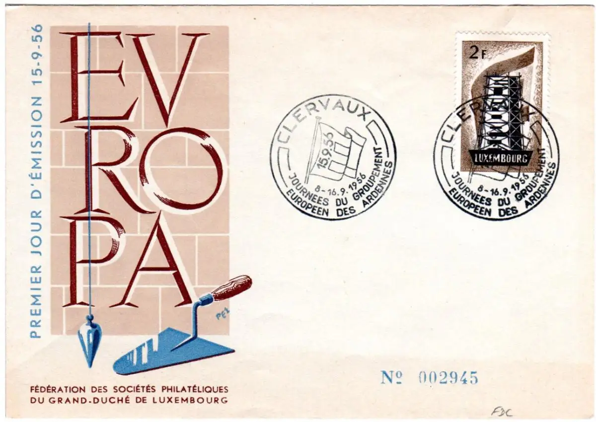 Luxemburg 555, 2 F. Europa auf schönem FDC (Kat. 120 €).