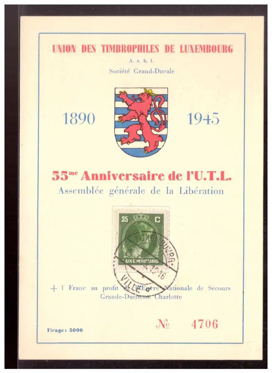 Luxemburg (020178) Gedenkblatt 1890- 1945 Union des Timbrophiles de Luxembourg