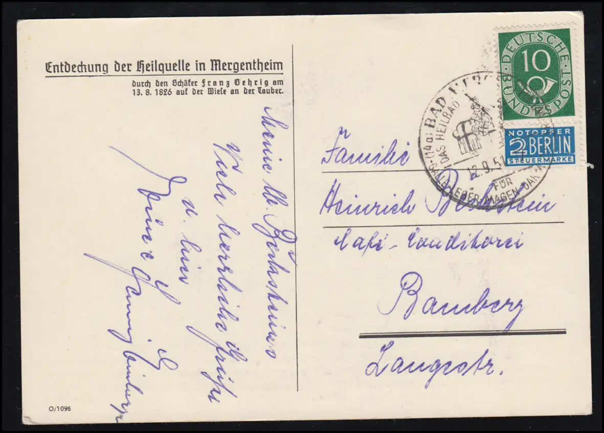 Epic Drama Poem Poèmes / Découverte de la source de guérison à Mergentheim par le berger Franz Gehrig le 13.8.1826 sur la prairie à la Tauber / Tampon spécial BAD MERGENTHEIM LE HEILBAD POUR - GALLE - LEBER- MAGEN - DARM - SUCRE 12.9.1951 / Figure: Chevalier sur gobelet avec lance Test: original Numéro d'article: 00000000033965