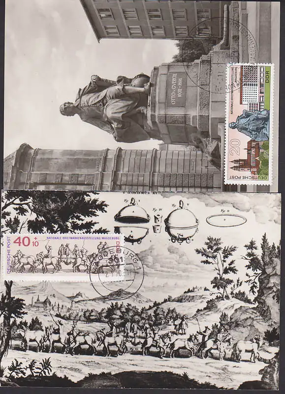 MC 1513, 1514 Otto von Guericke auf Ak, Magdeburger Halbkugel auf Foto