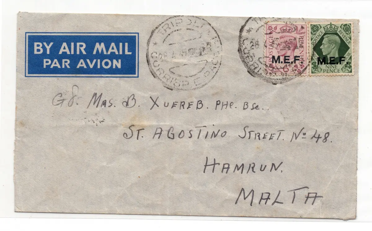 Umschlag - M.E.F. - Londoner Auflage Nr. 11 + 12 auf Luftumschlag von Tripolis nach Hamrun (Malta) am 28.4.45 - Umschlag in mittelmäßiger Qualität, aber interessantes Fachziel - Kat. euro 280 Cod. 2860/WEB