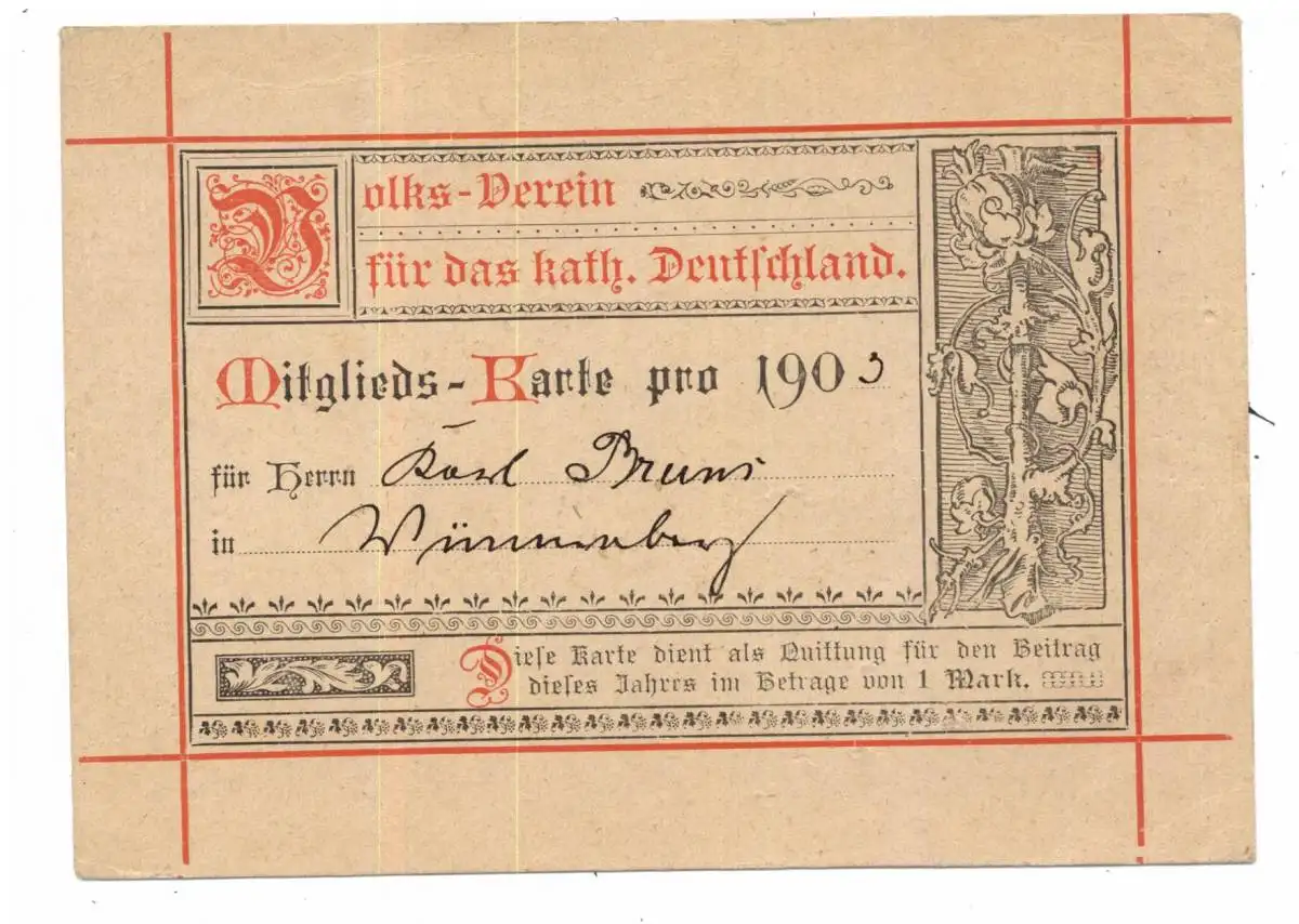 DOKUMENT - AUSWEIS, Mitglieds-Karte des Volks-Vereins für das Katholische Deutschland, 1903, Wünneberg