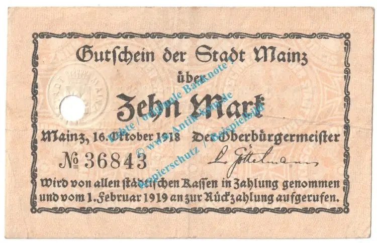Mainz , Notgeld 10 Mark Schein in gbr. Geiger 341.03-04 Hessen 1918 Grossnotgeld