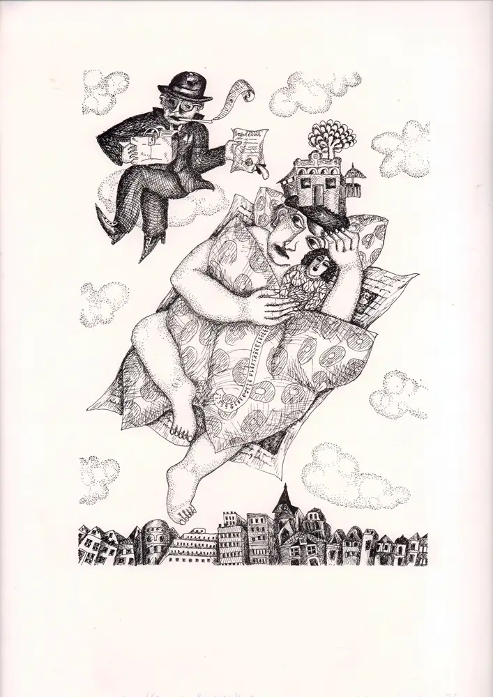 Man kann noch wegfliegen. Federzeichnung. Offset-Litho, Ungeheuer, Natascha