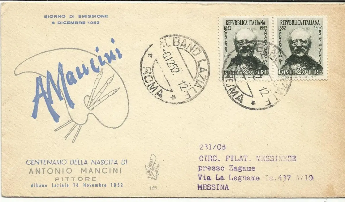 Mancini Nr. 703 Paar auf Umschlag FDC Venetia Club Venezia - Mancini Nr. 703 Paar auf Umschlag für Messina (ohne Ann. Ankunft) Cod. 439/2