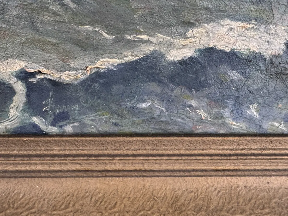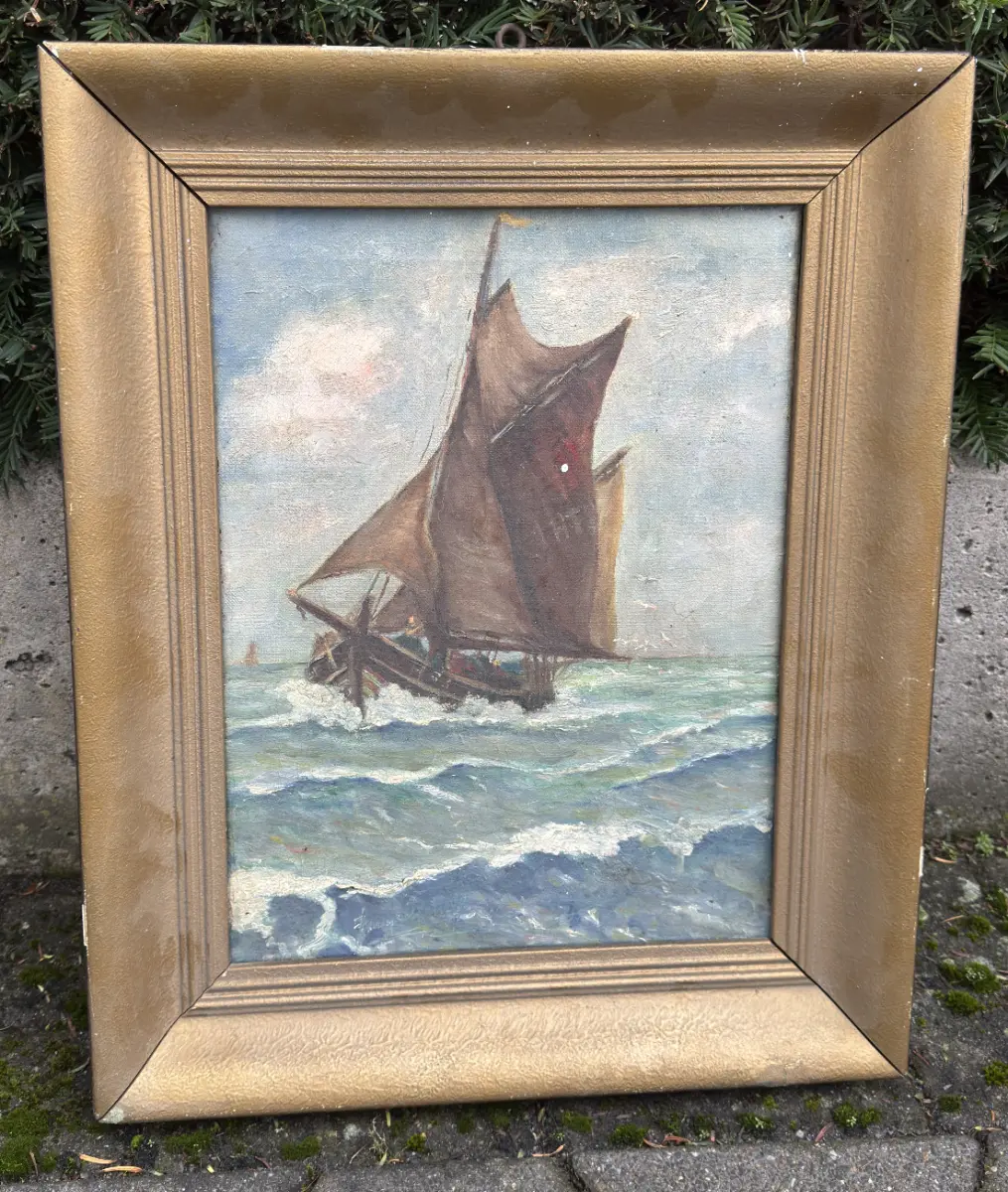Küstenmotiv mit eindrucksvoller maritiver Segelschiff-Szene um 1900 ? Im Zentrum steht ein zweimastiges Segelschiff mit weit gesetzten braunen Rahsegeln, die vom Wind stark gefüllt sind. Das Schiff fährt kraftvoll durch die bewegte See, sichtbar an den weiß brechenden Wellen und der dynamischen Bugwelle.