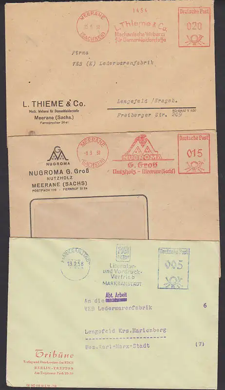 Markranstadt AFS FDGB Literatur-u. Vordruck Vertrieb, Meerane NUGROMA, Mechanische Weberei 1958