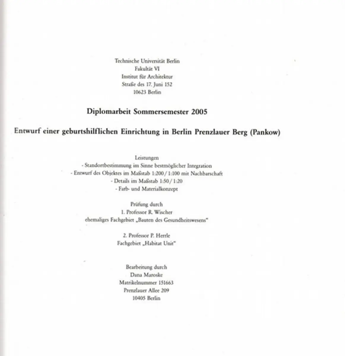 Maroske, Dana: Entwurf einer geburtshilflichen Einrichtung in Berlin Prenzlauer Berg (Pankow) - Diplomarbeit Sommersemester 2005, Technische Universität, Fak. VI, Berlin.