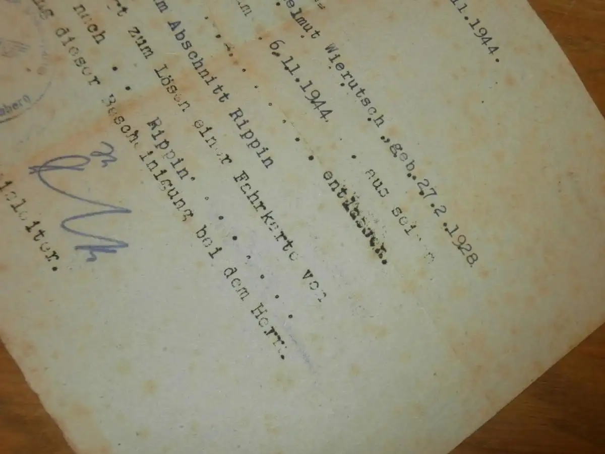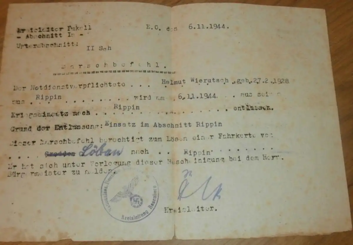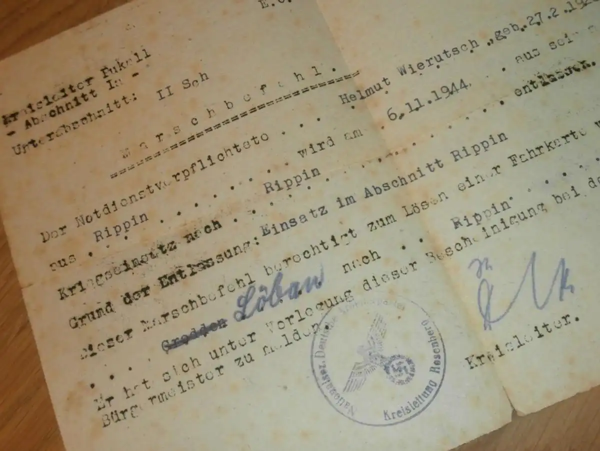 Marschbefehl Löbau / Grodden nach Rippin / Rypin bei Thorn , 1944 , Helmuth Wierutsch , Westpreußen , Mecklenburg !! Mit NSDAP - Stempel Rosenberg !!AZ-WR/1N