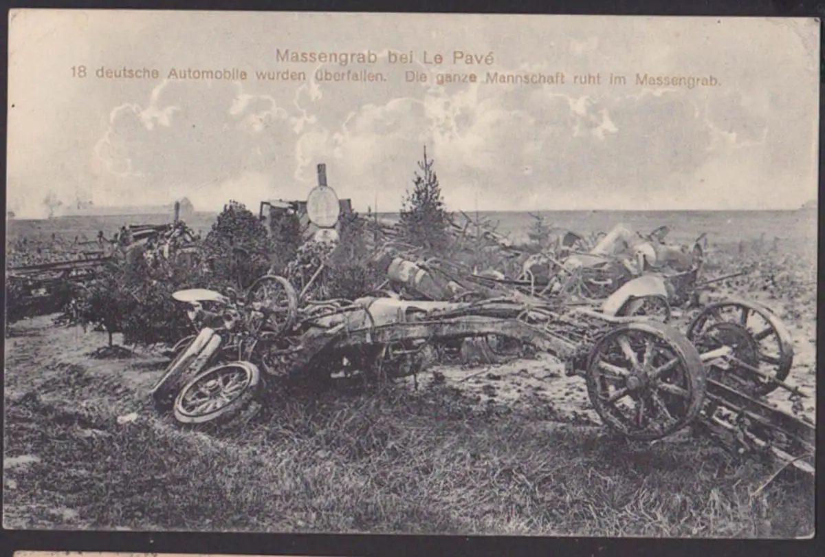 Massengrab bei Le Pave 18 deutsche Automobile ganze Mannschaft ruht im Massengrab, Feldpostkarte 1916
