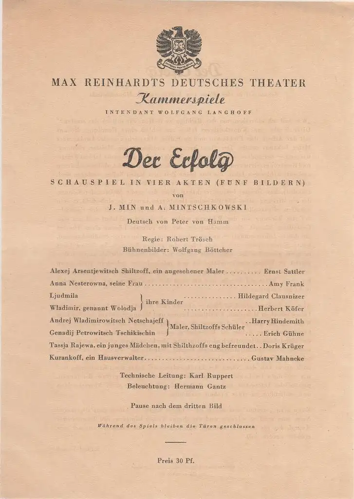 Max Reinhardts Deutsches Theater Kammerspiele, Wolfgang Langhoff: Theaterzettel J. Min / A. Mintschkowski DER ERFOLG.