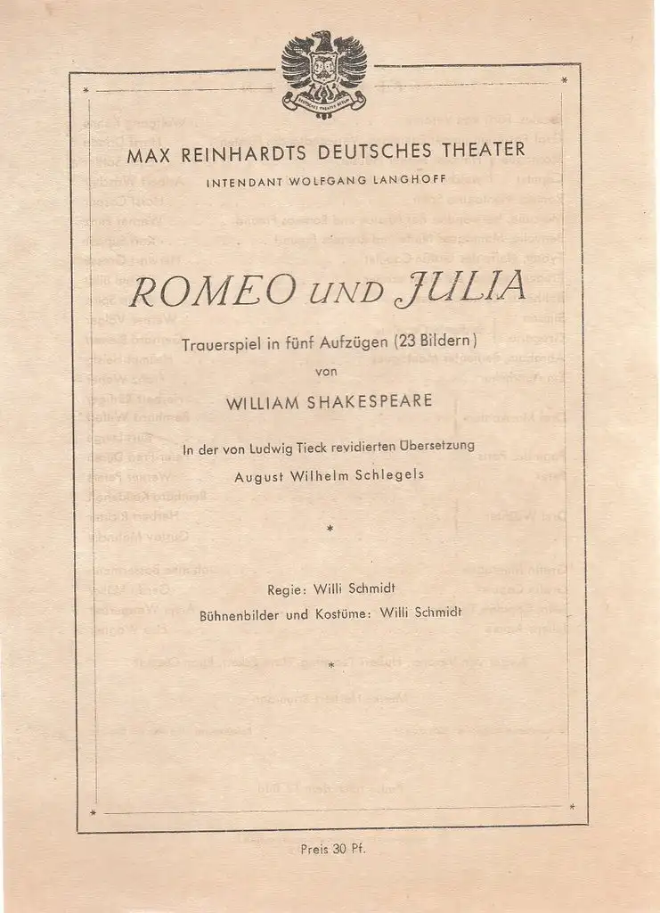 Max Reinhardts Deutsches Theater, Wolfgang Langhoff: Theaterzettel William Shakespeare ROMEO UND JULIA.