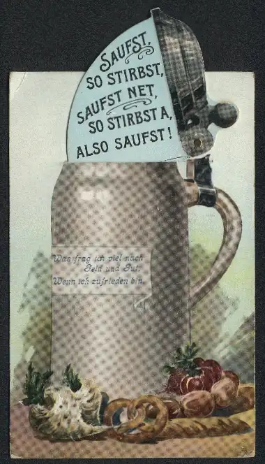 Mechanische-AK Spruch Saufst, so stirbst, saufst net, so stirbst a im Bierkrug neben Brezel und Gemüse
