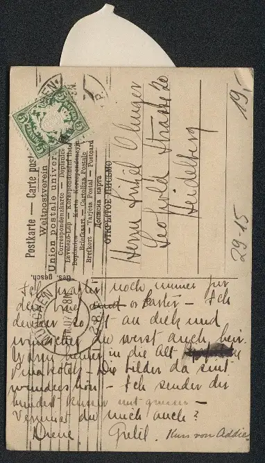 Personenbezogene Daten auf der Rückseite der Karte wurden durch blauen Textmarker unkenntlich gemacht. Die blauen Stellen sind auf die Vorderseite durchgeweicht und wirken sich negativ auf das Postkartenfoto aus