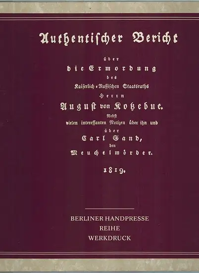 Titel: Authentischer Bericht über die Ermordung des Herrn August von Kotzebue und über Carl Sand den Meuchelmörder. 1819. Herausgegeben und mit kritischen Anmerkungen versehen. Die Illustrationen sind von Ralf Bergner. [= Berliner Handpresse - Reihe Werkdruck No. 27]