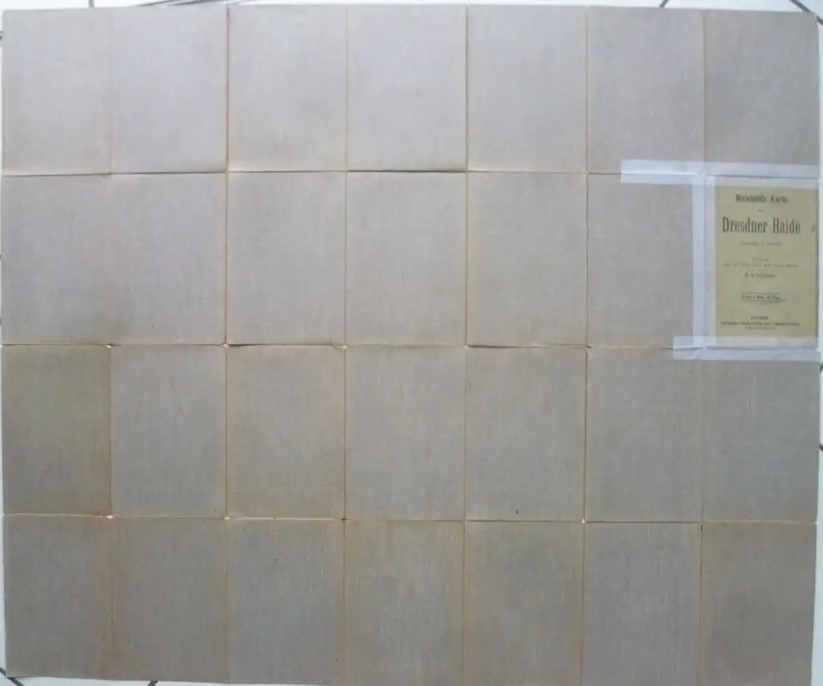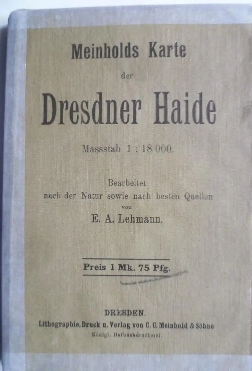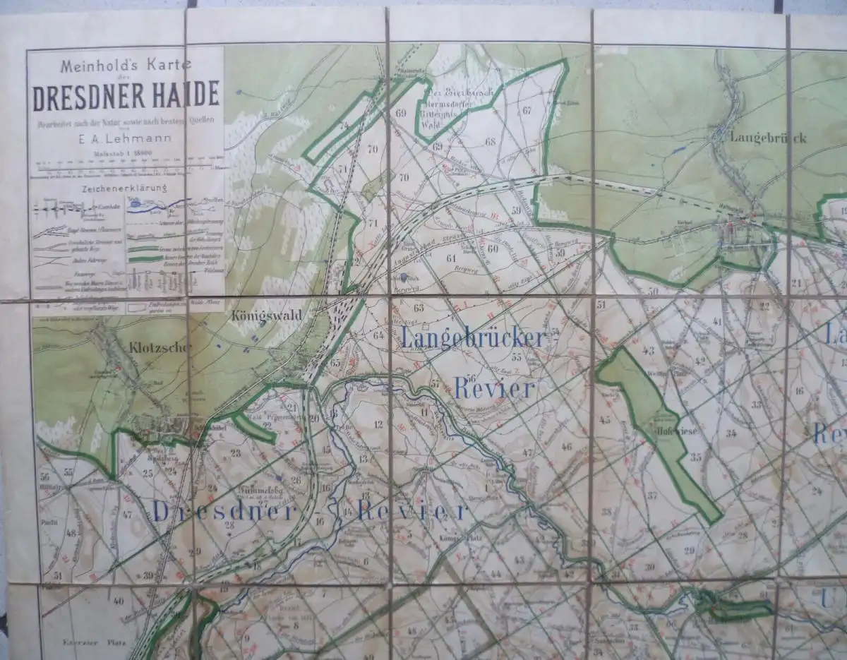 Meinholds Karte der Dresdner Haide Maßstab 1:18000. Bearbeitet nach der Natur sowie nach besten Quellen von E.A. Lehmann. Dresden, Lithographie, Druck und Verlag von C:C. Meinhold & Söhne, ohne Jahr (wegen der Schreibweise Haide mit ai vermutlich vor 1900). Farbg, Gesamtgröße ca. 60x70cm. In 28 Segmenten auf Leinen aufgezogen, ein Segment Faltstellen hinterlegt. Gut erhalten.