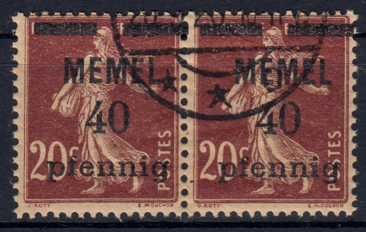 Memel 22a im Paar 40 Pf. auf 20 C, GC-Papier, gestempelt O mit Attestkopie