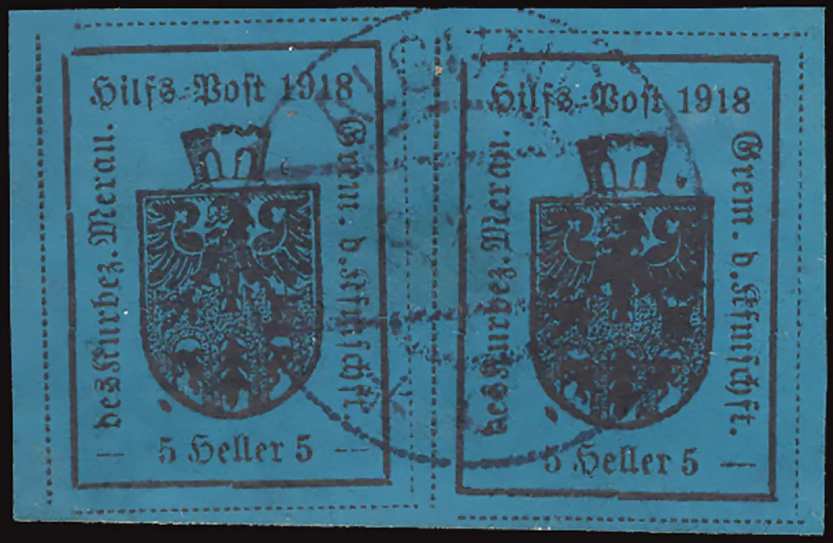 GEBRAUCHT - Meran - Wappen 5 h. IV. hellblauer Typ Nr. 11 horizontales Paar, davon eines mit scharfem komplettem Abziehbild - Sorte nicht katalogisiert (evtl. 11g) sehr gut marginiert mit kompletter Annullierung Cod.943/182