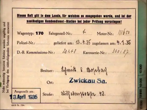 Mercedes-Benz Typ 170 Kundendienstheft 1935