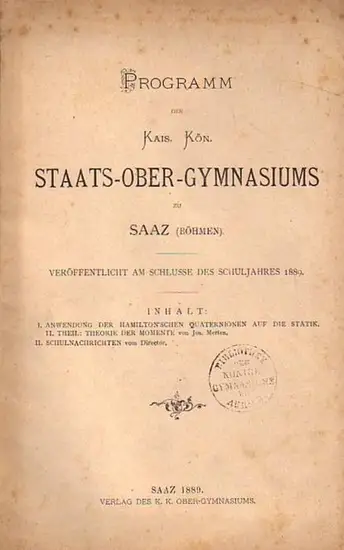 Titel: Anwendung der Hamilton´schen Quaternionen auf die Statik. Theil II: Theorie der Momente. In: Programm des Kais. Kön. Staats-Ober-Gymnasiums zu Saaz (Böhmen),1889. Mit Schulnachrichten