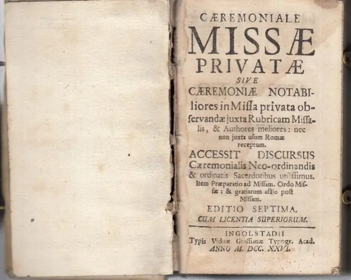 Messbücher: Caeremoniale Missae Privatae sive Caeremoniae Notabiliores in Missa privata observandae juxta Rubricam Missalis, & Authores meliores: nec non juxta usum Romae receptum. Accessit Discursus Caeremonialis Neo-ordinandis & ordinatis Sacerdotibu