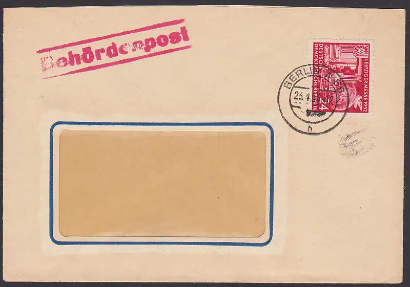 Messe 1952 24 Pfg. auf Brief mit Z1 Behördenpost, Abs. Zentrales Konstruktionsbüro