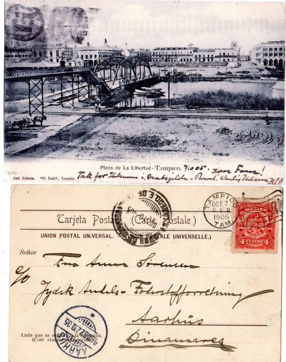 Mexiko 1905, 4 C. auf Plaza de la Libertad sw-AK v. Tampico n. Dänemark.