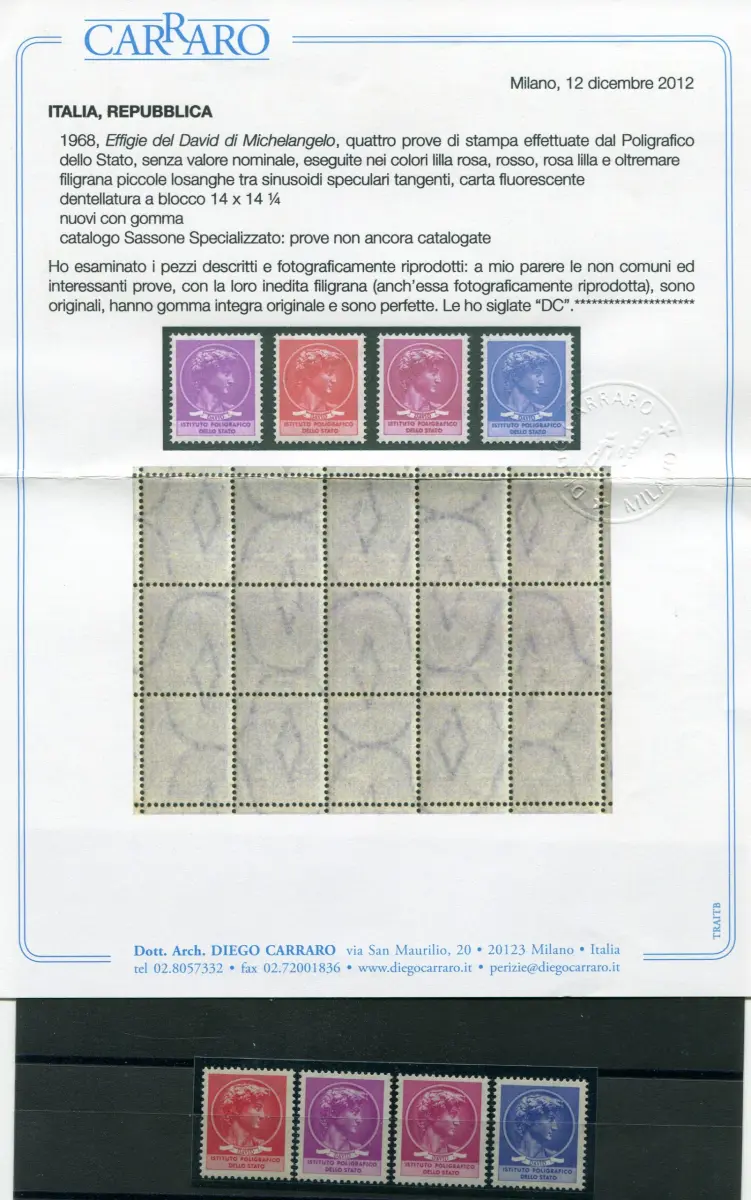 Michelangelos Davidskopf - Serie auf filigranem Sinuspapier und Rauten Vollgummi MNH - Michelangelos Davidskopf - Serie von vier gezackten Blockproben, die auf filigranem Sinuspapier und Rauten in den Farben lila rosa, rot, rosa lila und blau gedruckt sind (Kat. Manelli Nr. 16/19) - Seltenes Ensemble - Zert. Carraro Code 483/7