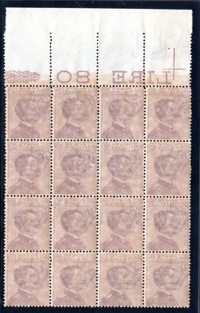 Vollgummi MNH - Michetti Cent. 20 violett braun Nr. 204f Block von sechzehn Exemplaren mit scharfem komplettem Abziehbild Bogenrand - neu perfekt mit Vollgummi - Gebraucht Katalog Euro480 Cod.2141/WEB