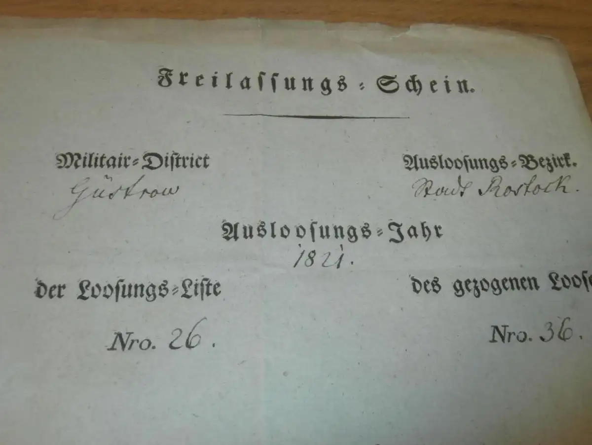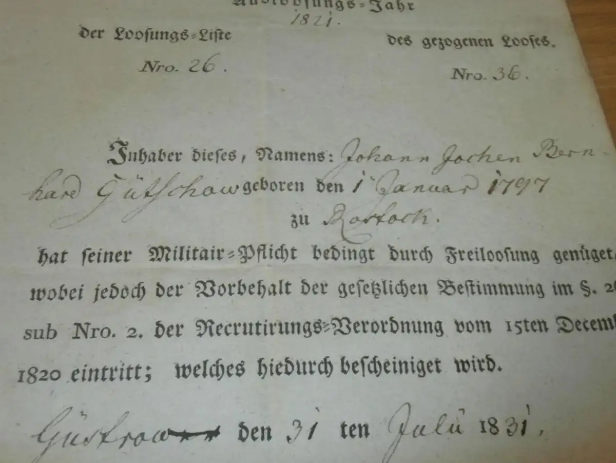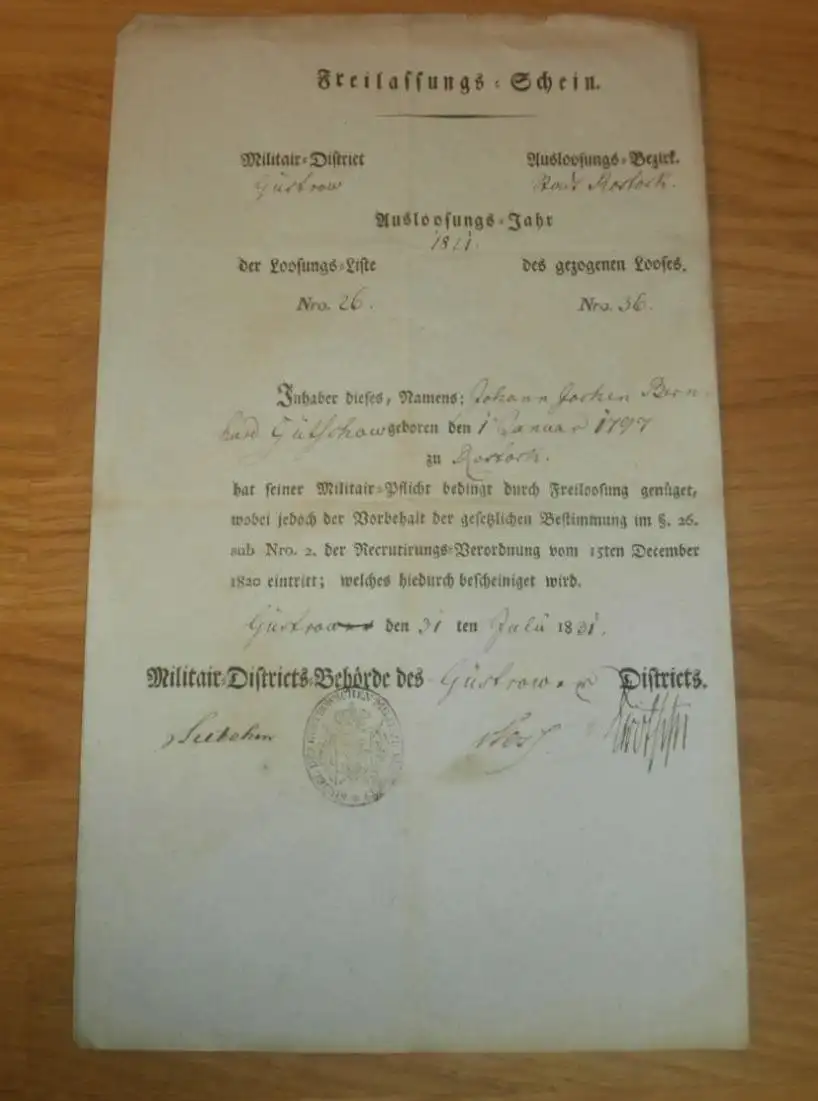 Militär Freilassungsschein Güstrow 1831 , J.B. Gütschow in Rostock i. Mecklenburg , Einberufung , Entlassung , Armee !!!