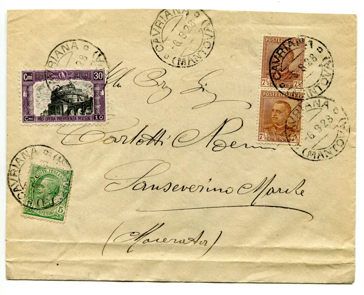- Miliz II Cent. 30 Nr. 220 + Ergänzungen Nr. 81 + Paar der Nr. 224 auf Umschlag von Cavriana nach Sanseverino am 6.8.28 - Interessante Verwendung im Tarif mit Cent-Briefmarken. 7,1/2 - Kat. Euro 230 n. 127/A