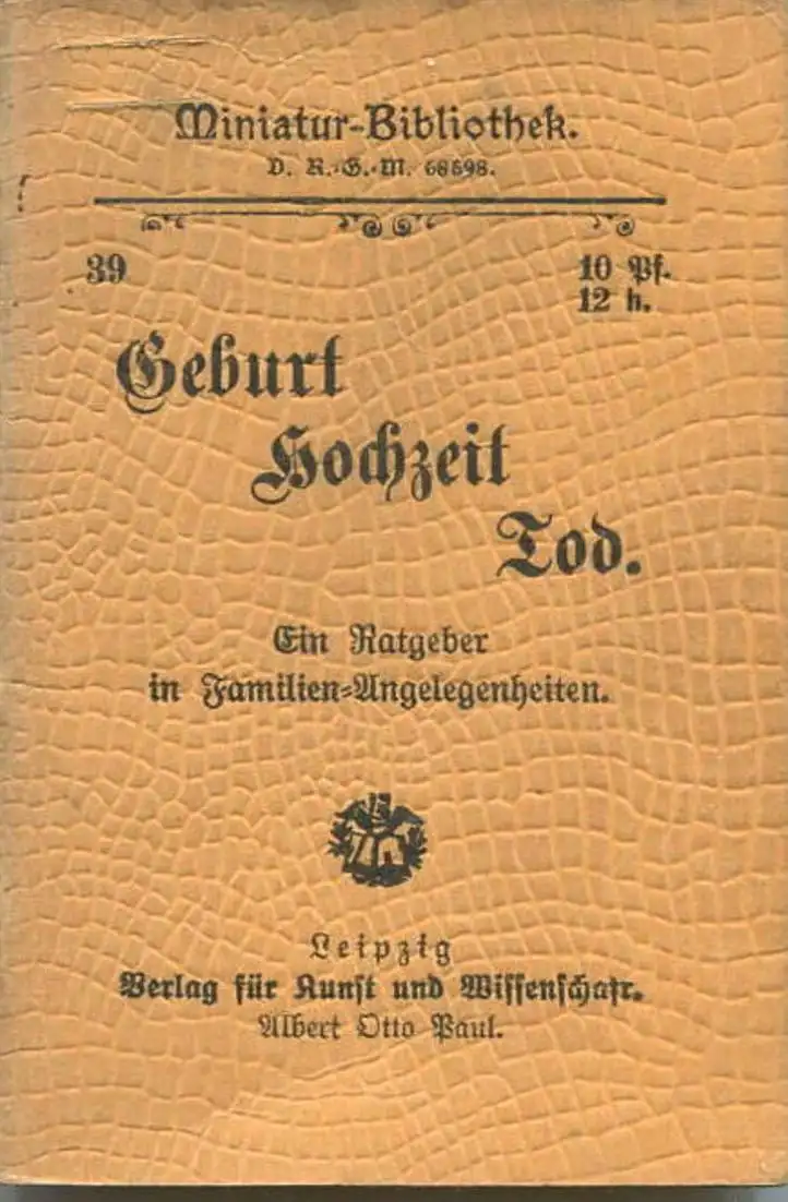 Miniatur-Bibliothek Nr. 39 - Geburt Hochzeit Tod Ein Ratgeber in Familien-Angelegenheiten von Dr. Hans Brahm - 8cm x 11cm - 40 Seiten ca. 1900 - Verlag für Kunst und Wissenschaft Albert Otto Paul Leipzig - Gebrauchsspuren (G49235)