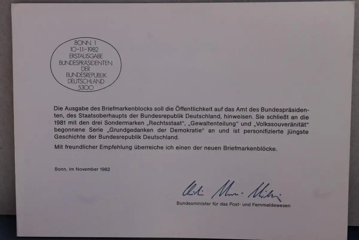 Ministerkarte zum Ausgabeanlaß: Blockausgabe "Bundespräsidenten", 10. Nov. 1982; MiNr. Block 18