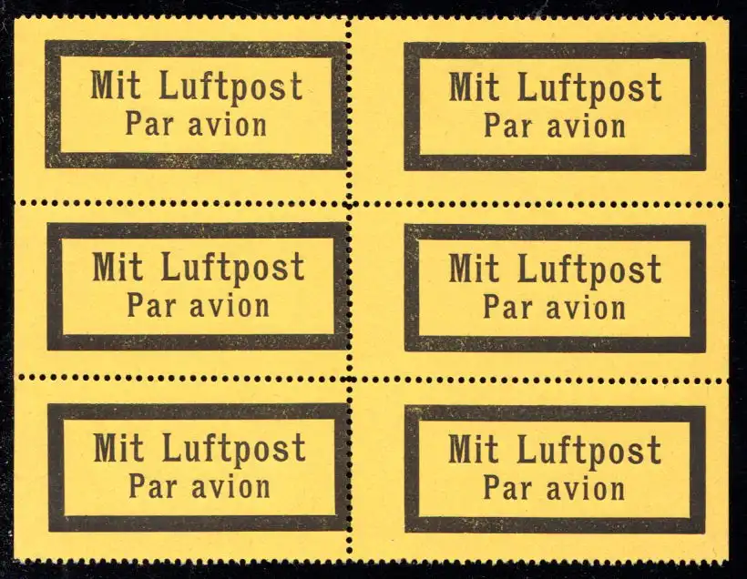 Mit Luftpost Par Avion, gelber Aufkleber, li.+re. ungezähnter 6er Block m. Gummi