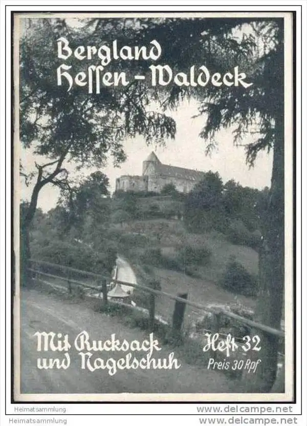 Mit Rucksack und Nagelschuh Heft 32 - Bergland - Hessen-Waldeck 1934 - 32 Seiten mit 7 Abbildungen - einer kleinen Karte 1:1250.000 und extra Kennung der Jugendherbergen - Triasdruck GmbH Berlin - Widmung auf der ersten Innenseite (G22306)