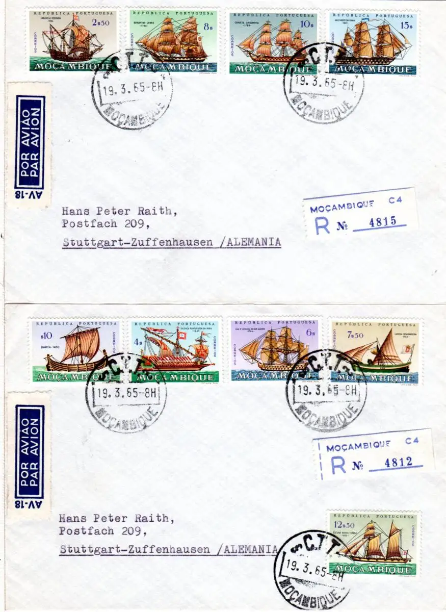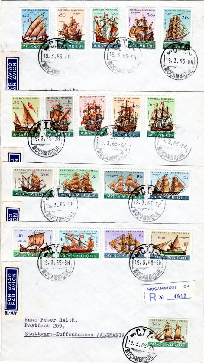 Mocambique 1965, 20 Werte Segelschiffe kpl. Ausgabe auf 4 Luftpost Reko Briefen