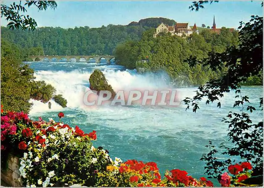 Cartes postales moderne Rheinfall mit Schoss Laufen Totale Breite totale Hohe Tiefe des Rheinfallbeckens Mittiere Sommer