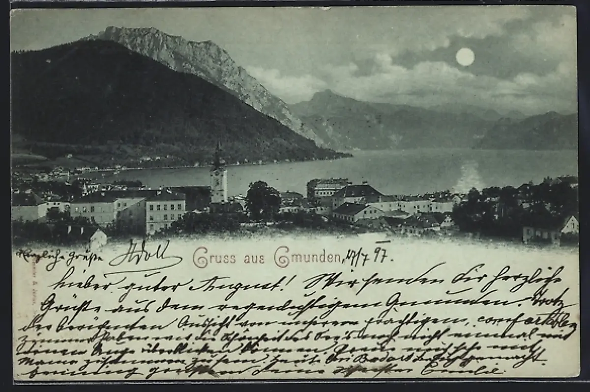 Mondschein-AK Gmunden, Teilansicht mit Bergen