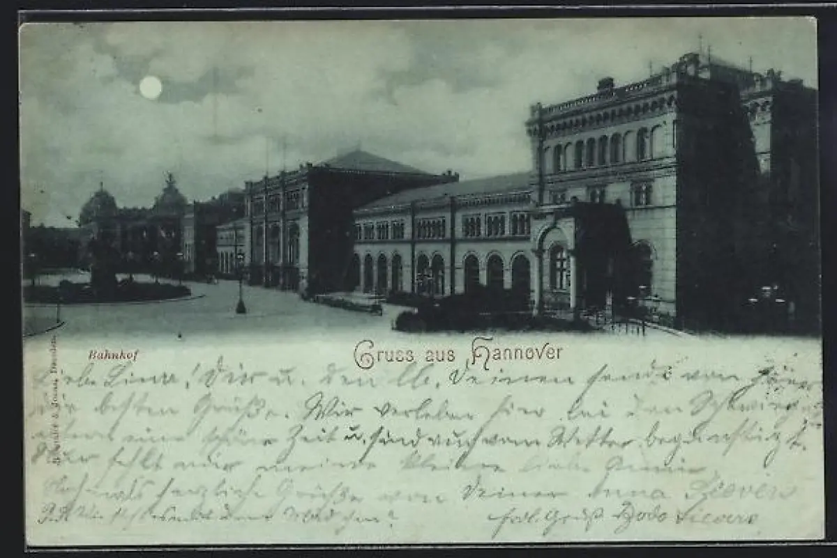 Mondschein-AK Hannover, Bahnhof mit Strassenpartie