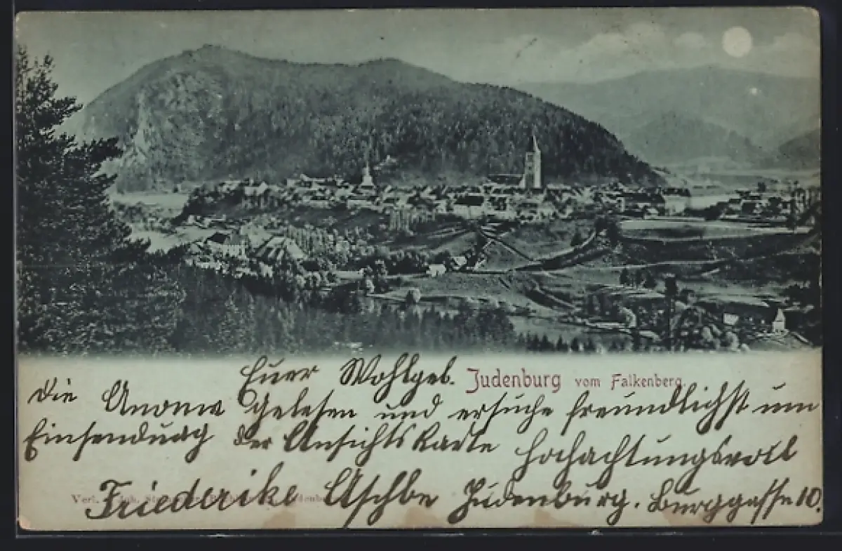 Mondschein-AK Judenburg, Teilansicht mit Kirche vom Falkenberg