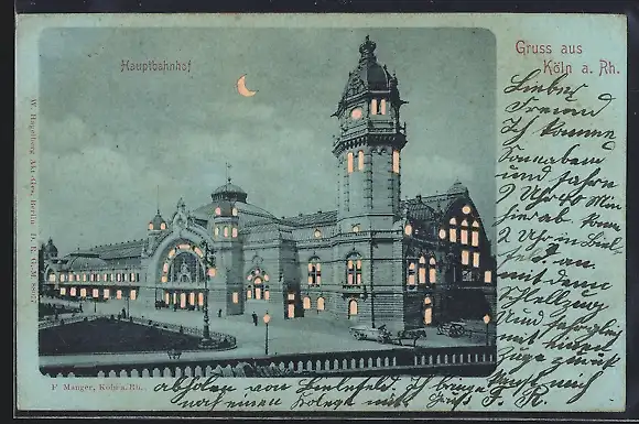 Mondschein-AK Köln a. Rh., Hauptbahnhof, Halt gegen das Licht: beleuchtete Fenster