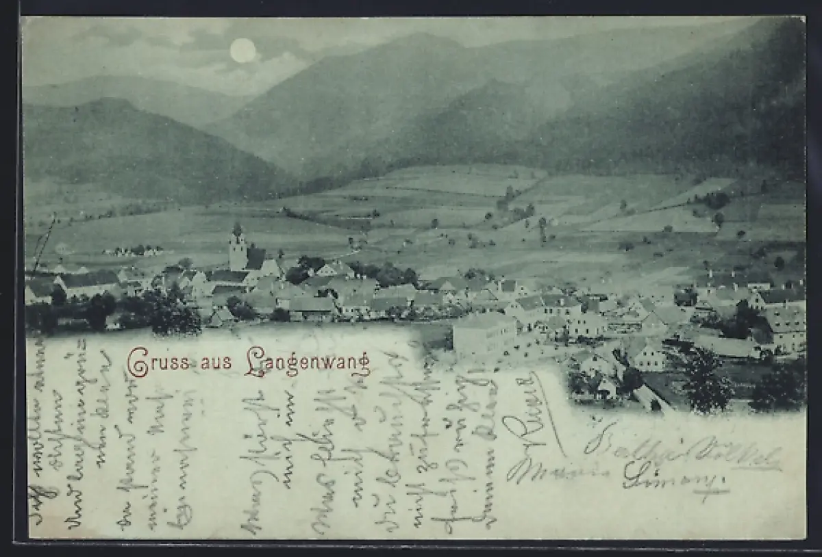 Mondschein-AK Langenwang, Gesamtansicht mit Feldern u. Bergpanorama aus der Vogelschau