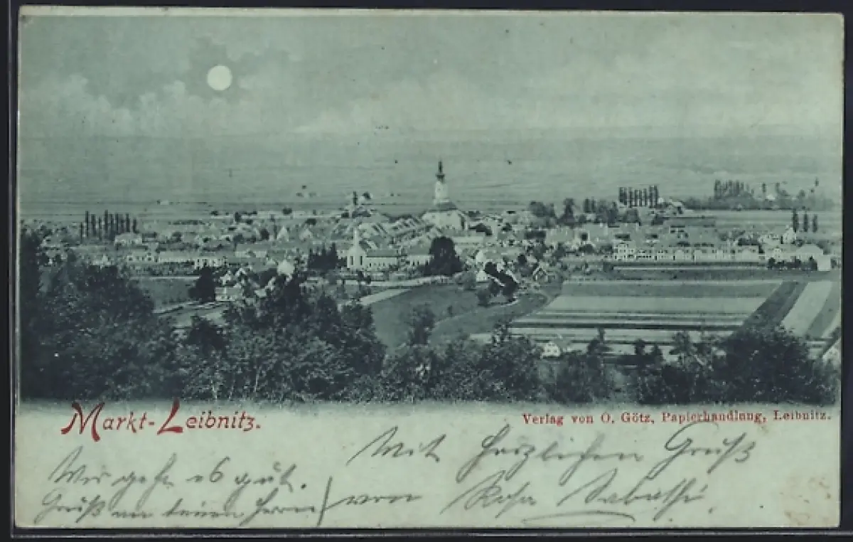 Mondschein-AK Leibnitz, Teilansicht mit Bäumen