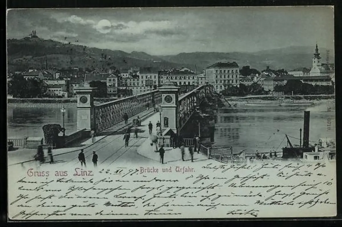 Mondschein-AK Linz, Brücke und Urfahr im Vollmondlicht