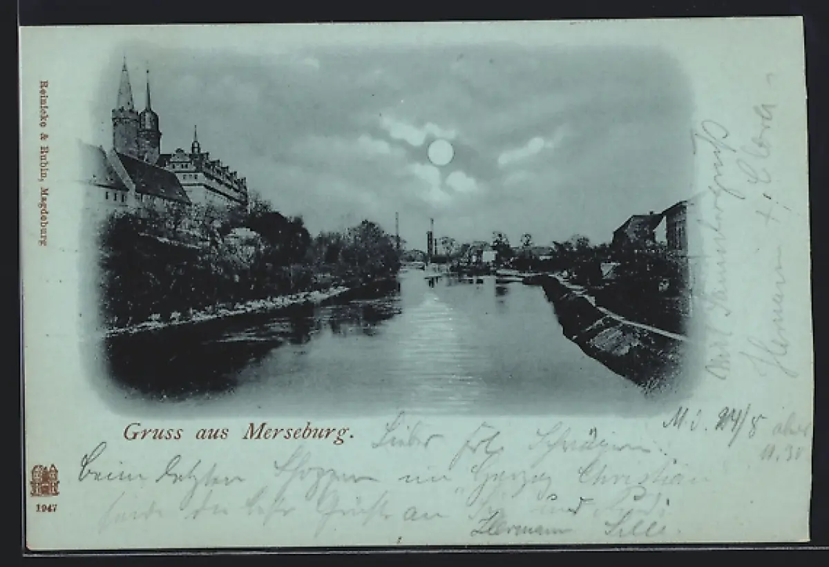 Mondschein-AK Merseburg, Blick vom Fluss auf die Kirche